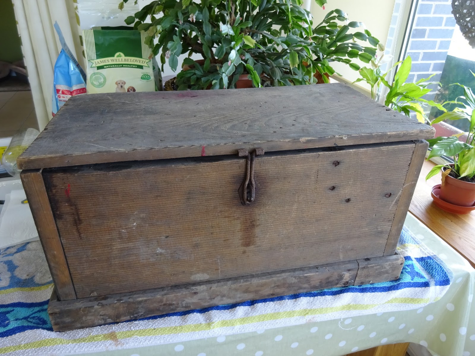 Not quite as pretty to look at but also a thing of beauty to me is this old chest. We found it when we were emptying Mum and Dad's garage of Dad's hoard of old things. Buried deep amongst all the other 'treasures' it was full of bits of junk, I couldn't see it thrown in the skip when it had obviously meant something to Dad, so it's been languishing in one shed after another of ours for the last couple of years. I suddenly had the urge to finally do something with it.